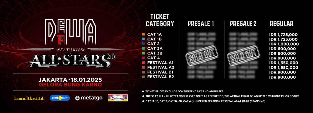 Saat ini Harga tiket* untuk konser “DEWA19 Featuring All Stars 2.0” sudah memasuki fase harga Tiket Regular dan tersedia di dewatiket.id, tiket.com, metalgo.id dan Indomaret terdekat.