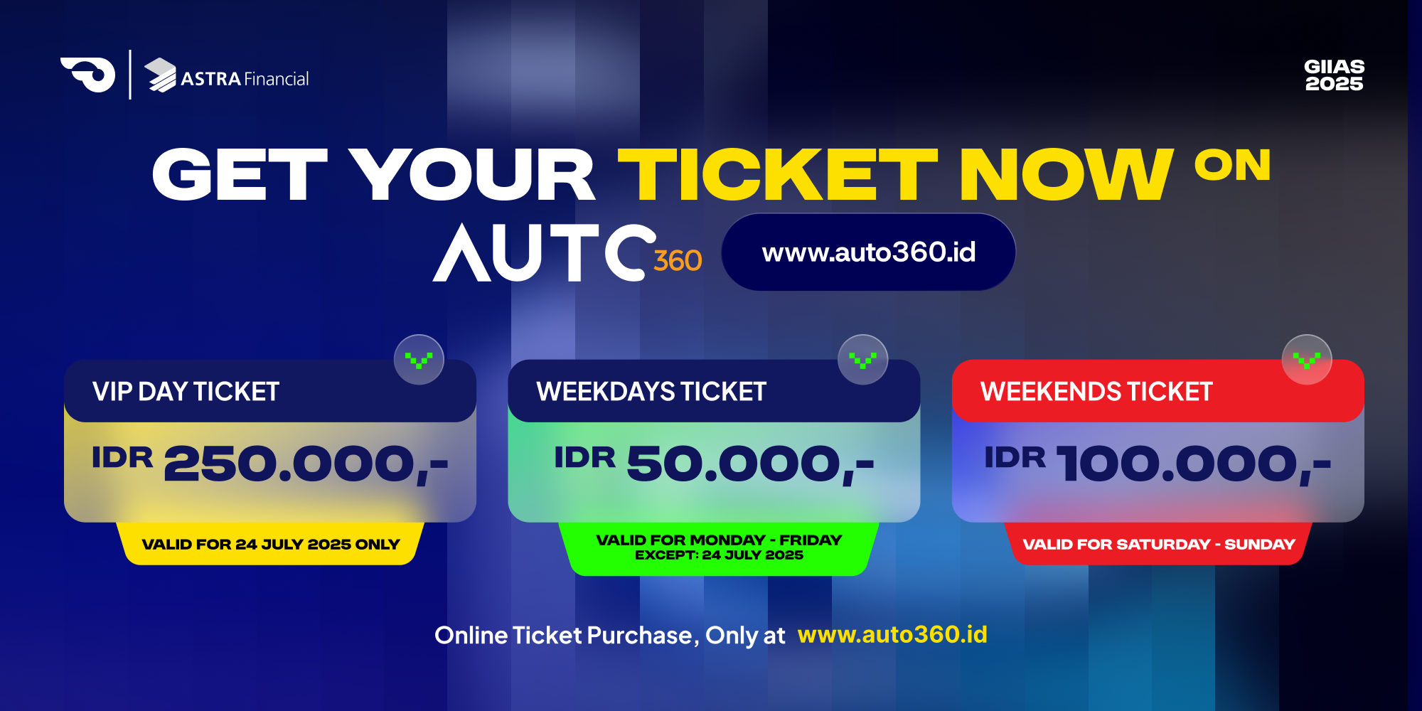 Tak perlu tunggu gajian untuk lihat kejutan otomotif tak terlupakan di GIIAS 2025. Tiket GIIAS 2025 sudah bisa dibeli dari sekarang! Mau datang saat VIP Day, Weekdays, atau seru-seruan di Weekend, BISA! Pastikan kamu sudah siap jalan ke GIIAS 2025. Tiket GIIAS 2025 sekarang sudah tersedia dan bisa kamu dapatkan dengan harga spesial melalui website www.auto360.id.  |